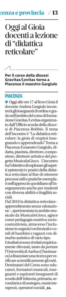 - Settembre 2023, Seminario sulla didattica reticolare e altre didattiche musicali inclusive. Conservatorio di Musica di Reggio Emilia.